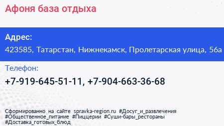 Афоня, база отдыха по адресу 423585, Татарстан, Нижнекамск, Пролетарская улица, 56а в дальнейшем Организация, размещена в следующих категориях: