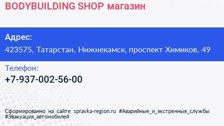 BODYBUILDING SHOP, магазин по адресу 423575, Татарстан, Нижнекамск, проспект Химиков, 49 в дальнейшем Организация, размещена в следующих категориях: