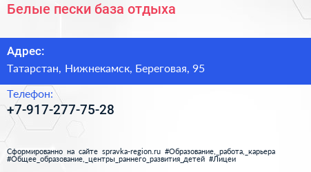 Белые пески, база отдыха по адресу Татарстан, Нижнекамск, Береговая, 95 в дальнейшем Организация, размещена в следующих категориях: