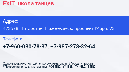 EXIT, школа танцев по адресу 423578, Татарстан, Нижнекамск, проспект Мира, 93 в дальнейшем Организация, размещена в следующих категориях: