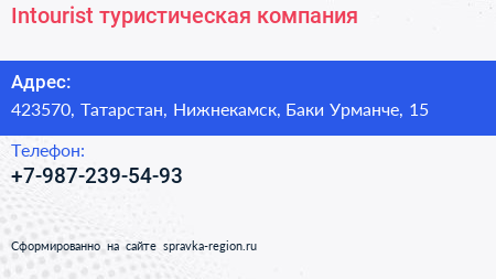 Intourist, туристическая компания по адресу 423570, Татарстан, Нижнекамск, Баки Урманче, 15 в дальнейшем Организация, размещена в следующих категориях: