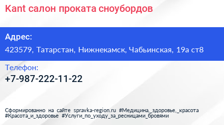 Kant, салон проката сноубордов по адресу 423579, Татарстан, Нижнекамск, Чабьинская, 19а ст8 в дальнейшем Организация, размещена в следующих категориях: