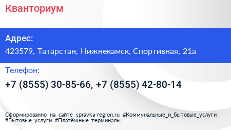 Кванториум по адресу 423579, Татарстан, Нижнекамск, Спортивная, 21а в дальнейшем Организация, размещена в следующих категориях: