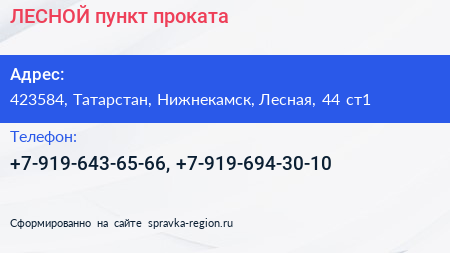 ЛЕСНОЙ, пункт проката по адресу 423584, Татарстан, Нижнекамск, Лесная, 44 ст1 в дальнейшем Организация, размещена в следующих категориях: