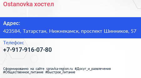 Ostanovka, хостел по адресу 423584, Татарстан, Нижнекамск, проспект Шинников, 57 в дальнейшем Организация, размещена в следующих категориях: