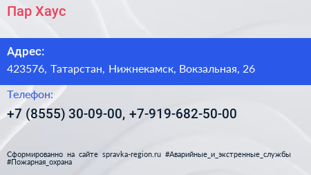 Пар Хаус по адресу 423576, Татарстан, Нижнекамск, Вокзальная, 26 в дальнейшем Организация, размещена в следующих категориях: