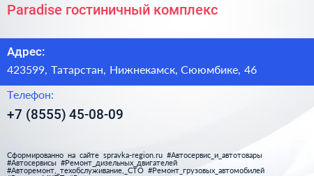 Paradise, гостиничный комплекс по адресу 423599, Татарстан, Нижнекамск, Сююмбике, 46 в дальнейшем Организация, размещена в следующих категориях: