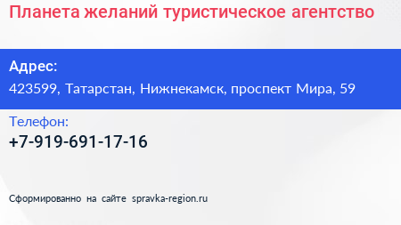 Планета желаний, туристическое агентство по адресу 423599, Татарстан, Нижнекамск, проспект Мира, 59 в дальнейшем Организация, размещена в следующих категориях: