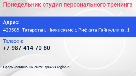 Понедельник, студия персонального тренинга по адресу 423585, Татарстан, Нижнекамск, Рифката Гайнуллина, 1 в дальнейшем Организация, размещена в следующих категориях: