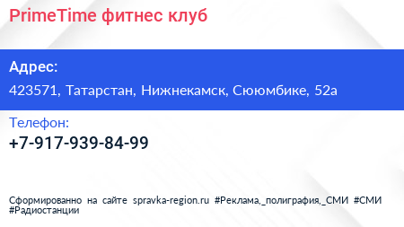 PrimeTime, фитнес-клуб по адресу 423571, Татарстан, Нижнекамск, Сююмбике, 52а в дальнейшем Организация, размещена в следующих категориях: