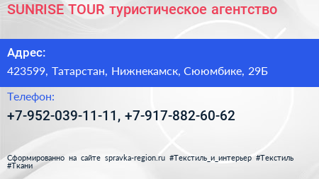SUNRISE TOUR, туристическое агентство по адресу 423599, Татарстан, Нижнекамск, Сююмбике, 29Б в дальнейшем Организация, размещена в следующих категориях: