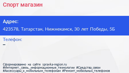 Спорт, магазин по адресу 423578, Татарстан, Нижнекамск, 30 лет Победы, 5Б в дальнейшем Организация, размещена в следующих категориях: