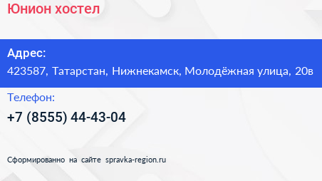 Юнион, хостел по адресу 423587, Татарстан, Нижнекамск, Молодёжная улица, 20в в дальнейшем Организация, размещена в следующих категориях: