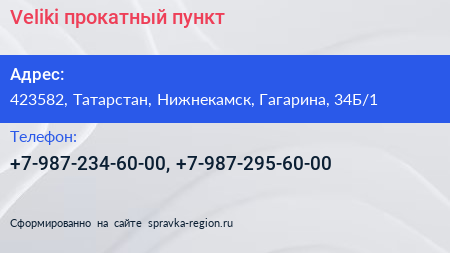 Veliki, прокатный пункт по адресу 423582, Татарстан, Нижнекамск, Гагарина, 34Б/1 в дальнейшем Организация, размещена в следующих категориях: