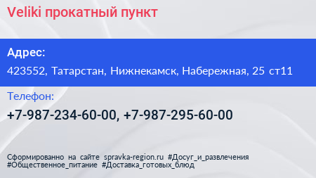 Veliki, прокатный пункт по адресу 423552, Татарстан, Нижнекамск, Набережная, 25 ст11 в дальнейшем Организация, размещена в следующих категориях: