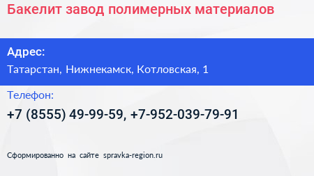 Бакелит, завод полимерных материалов по адресу Татарстан, Нижнекамск, Котловская, 1 в дальнейшем Организация, размещена в следующих категориях: