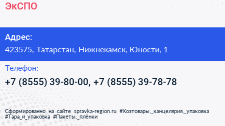 ЭкСПО+ по адресу 423575, Татарстан, Нижнекамск, Юности, 1 в дальнейшем Организация, размещена в следующих категориях: