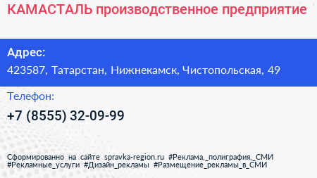 КАМАСТАЛЬ, производственное предприятие по адресу 423587, Татарстан, Нижнекамск, Чистопольская, 49 в дальнейшем Организация, размещена в следующих категориях: