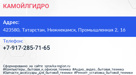 КАМОЙЛГИДРО по адресу 423580, Татарстан, Нижнекамск, Промышленная 2, 16 в дальнейшем Организация, размещена в следующих категориях: