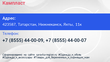 Кампласт по адресу 423587, Татарстан, Нижнекамск, Якты, 11к в дальнейшем Организация, размещена в следующих категориях: