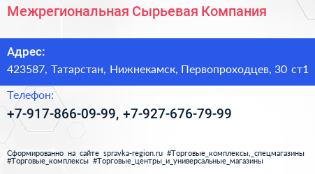 Межрегиональная Сырьевая Компания по адресу 423587, Татарстан, Нижнекамск, Первопроходцев, 30 ст1 в дальнейшем Организация, размещена в следующих категориях: