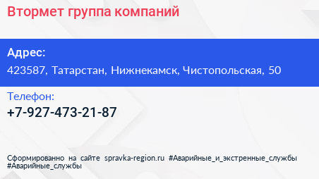 Втормет, группа компаний по адресу 423587, Татарстан, Нижнекамск, Чистопольская, 50 в дальнейшем Организация, размещена в следующих категориях: