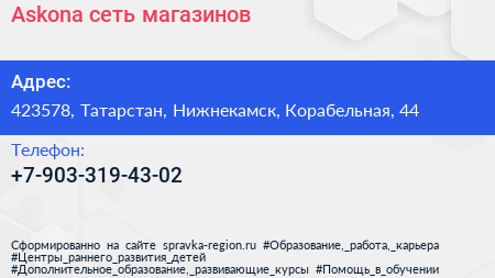 Askona, сеть магазинов по адресу 423578, Татарстан, Нижнекамск, Корабельная, 44 в дальнейшем Организация, размещена в следующих категориях: