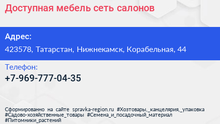 Доступная мебель, сеть салонов по адресу 423578, Татарстан, Нижнекамск, Корабельная, 44 в дальнейшем Организация, размещена в следующих категориях: