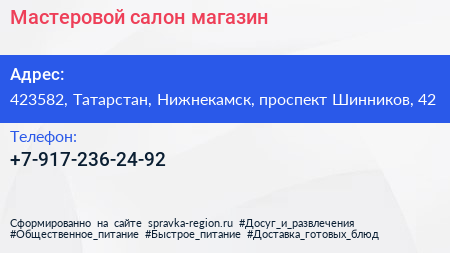 Мастеровой, салон-магазин по адресу 423582, Татарстан, Нижнекамск, проспект Шинников, 42 в дальнейшем Организация, размещена в следующих категориях:
