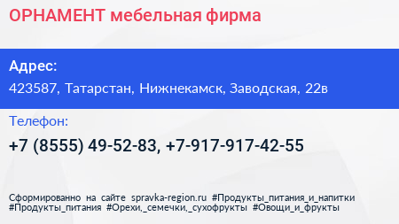 ОРНАМЕНТ, мебельная фирма по адресу 423587, Татарстан, Нижнекамск, Заводская, 22в в дальнейшем Организация, размещена в следующих категориях: