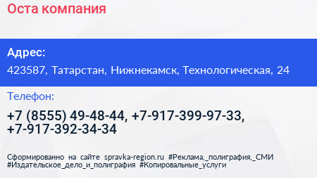 Оста, компания по адресу 423587, Татарстан, Нижнекамск, Технологическая, 24 в дальнейшем Организация, размещена в следующих категориях: