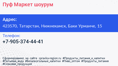 Пуф-Маркет, шоурум по адресу 423570, Татарстан, Нижнекамск, Баки Урманче, 15 в дальнейшем Организация, размещена в следующих категориях: