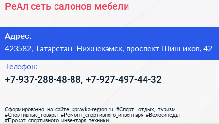 РеАл, сеть салонов мебели по адресу 423582, Татарстан, Нижнекамск, проспект Шинников, 42 в дальнейшем Организация, размещена в следующих категориях: