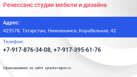 Ренессанс, студия мебели и дизайна по адресу 423578, Татарстан, Нижнекамск, Корабельная, 42 в дальнейшем Организация, размещена в следующих категориях: