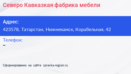 Северо-Кавказкая фабрика мебели по адресу 423578, Татарстан, Нижнекамск, Корабельная, 42 в дальнейшем Организация, размещена в следующих категориях: