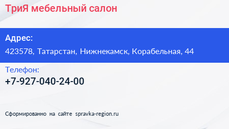 ТриЯ, мебельный салон по адресу 423578, Татарстан, Нижнекамск, Корабельная, 44 в дальнейшем Организация, размещена в следующих категориях: