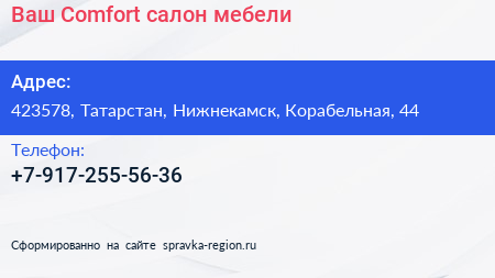 Ваш Comfort, салон мебели по адресу 423578, Татарстан, Нижнекамск, Корабельная, 44 в дальнейшем Организация, размещена в следующих категориях:
