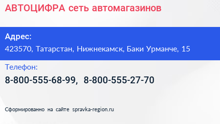 АВТОЦИФРА, сеть автомагазинов по адресу 423570, Татарстан, Нижнекамск, Баки Урманче, 15 в дальнейшем Организация, размещена в следующих категориях: