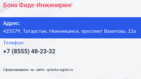 Бона Фиде Инжиниринг по адресу 423579, Татарстан, Нижнекамск, проспект Вахитова, 12а в дальнейшем Организация, размещена в следующих категориях: