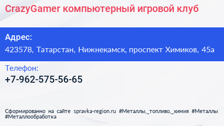 CrazyGamer, компьютерный игровой клуб по адресу 423578, Татарстан, Нижнекамск, проспект Химиков, 45а в дальнейшем Организация, размещена в следующих категориях:
