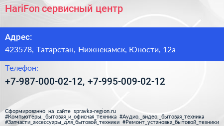HariFon, сервисный центр по адресу 423578, Татарстан, Нижнекамск, Юности, 12а в дальнейшем Организация, размещена в следующих категориях: