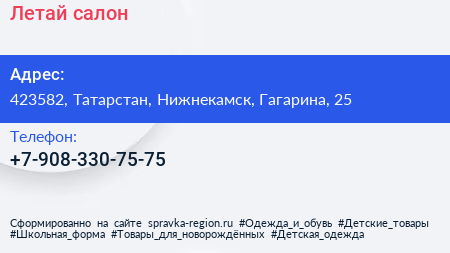 Летай, салон по адресу 423582, Татарстан, Нижнекамск, Гагарина, 25 в дальнейшем Организация, размещена в следующих категориях: