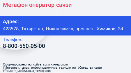 Мегафон, оператор связи по адресу 423578, Татарстан, Нижнекамск, проспект Химиков, 34 в дальнейшем Организация, размещена в следующих категориях: