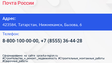 Почта России по адресу 423584, Татарстан, Нижнекамск, Бызова, 6 в дальнейшем Организация, размещена в следующих категориях: