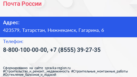 Почта России по адресу 423579, Татарстан, Нижнекамск, Гагарина, 6 в дальнейшем Организация, размещена в следующих категориях: