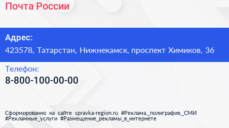 Почта России по адресу 423578, Татарстан, Нижнекамск, проспект Химиков, 36 в дальнейшем Организация, размещена в следующих категориях: