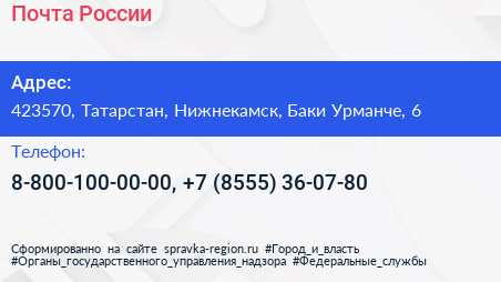 Почта России по адресу 423570, Татарстан, Нижнекамск, Баки Урманче, 6 в дальнейшем Организация, размещена в следующих категориях: