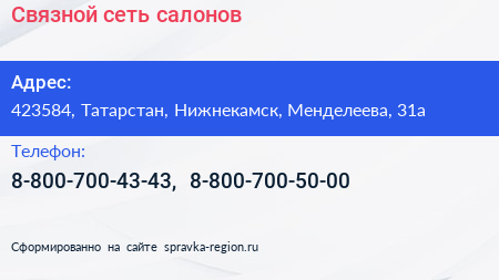 Связной, сеть салонов по адресу 423584, Татарстан, Нижнекамск, Менделеева, 31а в дальнейшем Организация, размещена в следующих категориях: