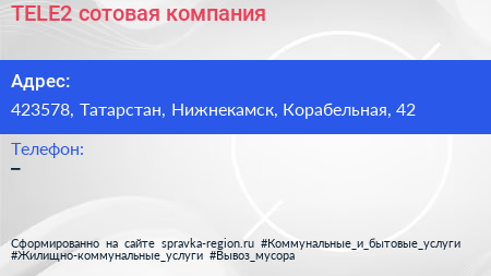 TELE2, сотовая компания по адресу 423578, Татарстан, Нижнекамск, Корабельная, 42 в дальнейшем Организация, размещена в следующих категориях: