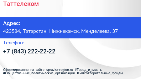 Таттелеком по адресу 423584, Татарстан, Нижнекамск, Менделеева, 37 в дальнейшем Организация, размещена в следующих категориях: